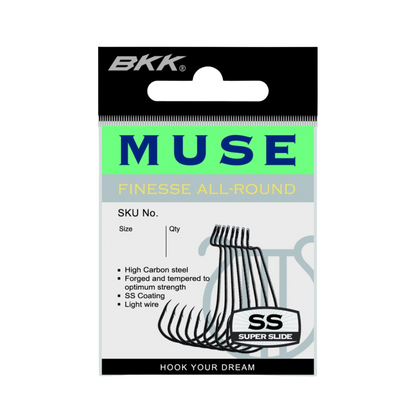 O BKK Muse é um anzol finesse para minhocas, desenvolvido para apresentações antienrosco com iscas soft, sendo ideal para a pesca em locais com alta pressão de pesca.
